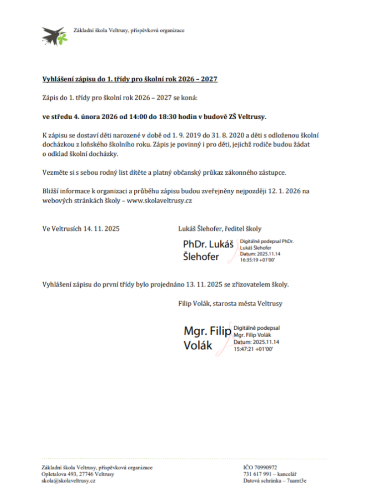 Zápis do 1. třídy pro školní rok 2026 - 2027 se koná ve středu 4. února 2026 od 14:00 do 18:30 v budově ZŠ Veltrusy. Více informací níže: