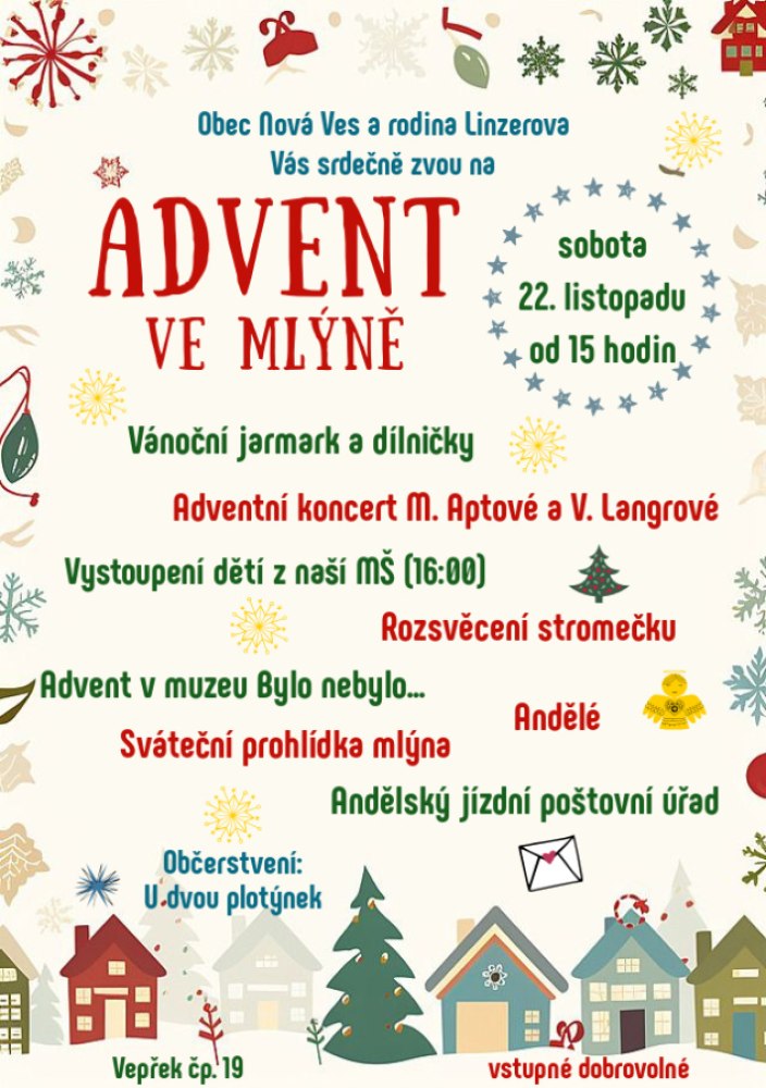 Obec Nová Ves a rodina Linzerova Vás srdcečně zvou na Advent ve mlýně. Těšit se můžete na  bohatý program, občerstvení i prohlídku muzea a mlýna.