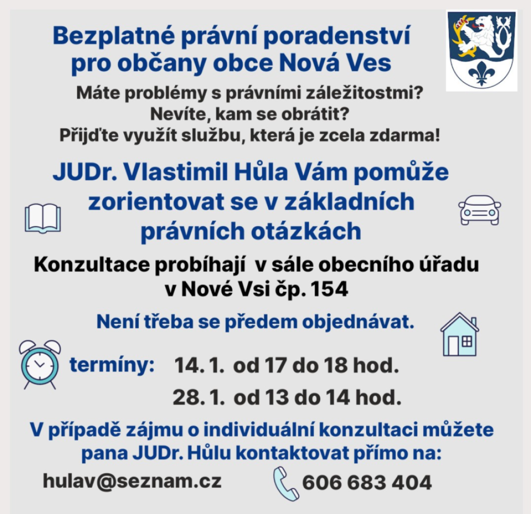 Máte roblémy s právními záležitostmi? Nevíte, kam se obrátit? Přijďte využít službu, které je zcela zdarma pro občany obce.