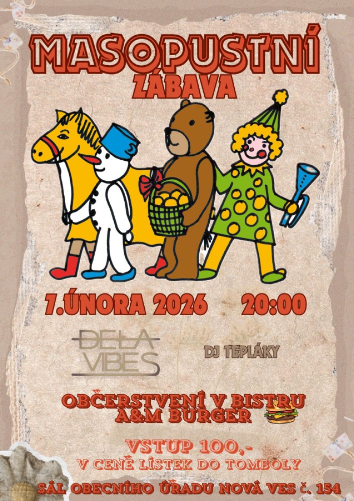 Již tradičně vás zveme na Masopustní zábavu, kde nebude chybět dobrá nálada, masky, hudba ani tombola